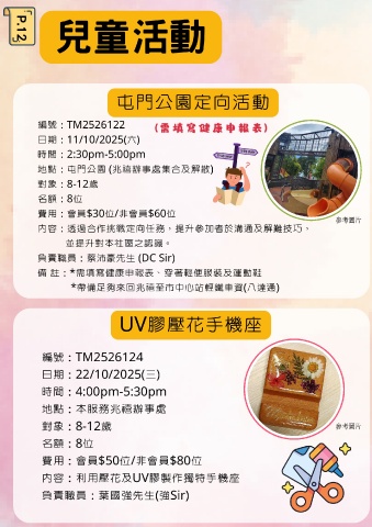 兒童活動                                                                           所有體能活動,均須填報健康申報表,沒呈交則不能上課,並不能退款。                               社工系列活動