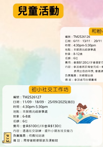 兒童活動                                                                         所有體能活動,均須填報健康申報表,沒呈交則不能上課,並不能退款。                               社工系列活動