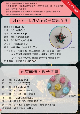 親子活動  所有體能活動,均須填報健康申報表,沒呈交則不能上課,並不能退款。                                社工系列活動