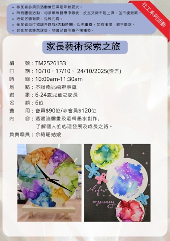 日  期:9/9、16/9、 23/9、30/9/2025(逢二)  負責職員:余綺珊姑娘