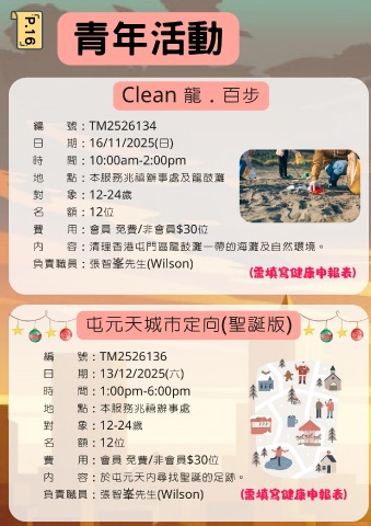 青年活動                                                                      所有體能活動,均須填報健康申報表,沒呈交則不能上課,並不能退款。                                社工系列活動