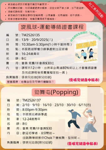 青年活動  所有體能活動,均須填報健康申報表,沒呈交則不能上課,並不能退款。                                社工系列活動