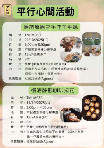 平行心間活動 所有體能活動,均須填報健康申報表,沒呈交則不能上課,並不能退款。所有體能活動,均須填報健康申報表,沒呈交則不能上課,並不能退款。 社工系列活動
