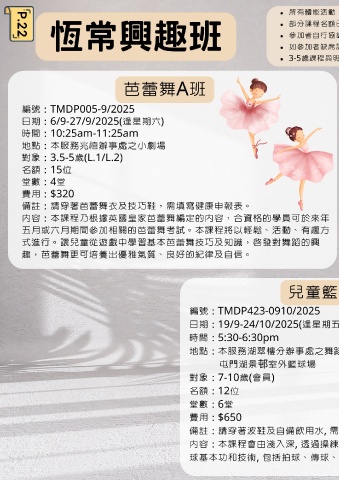 備註:請穿著芭蕾舞衣及技巧鞋,需填寫健康申報表。 備註:請穿著彈性長褲及帶備瑜伽墊,需填寫健康申報表。