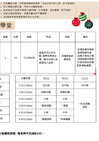 12/2025 自我成長篇 小五學生 31/12/2025 10:00-1:00pm(24/12) 6 10 *$1,800/位 理、建立自信心及 舞蹈室 -填寫健康申報表